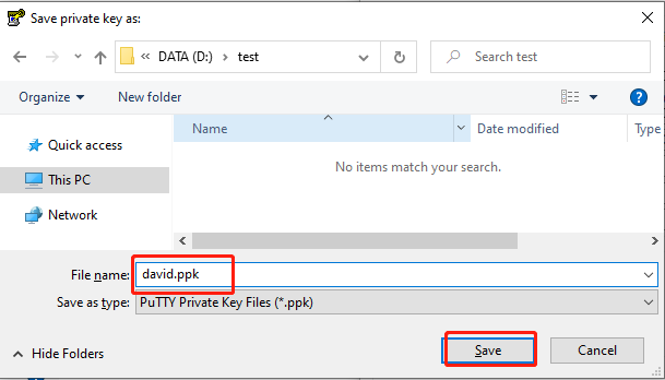 5. 팝업된 창에서 키를 저장한 경로를 선택하고 파일명 란에 '키 이름.ppk'를 입력한 후 [저장] 버튼을 클릭합니다. 예를 들어, 아래의 이미지와 같이 david 개인키 파일을 다른 이름으로 저장하기를 통해 david.ppk 키 파일로 저장합니다.