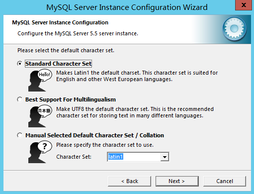 Standard Character Set(표준 문자 세트)는 Latin1 서버 문자 세트를 기본으로 합니다.