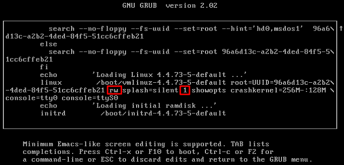 2. e를 눌러 커널 편집 인터페이스로 들어간 뒤, ↑↓ 버튼으로 linux의 첫번째 항으로 이동해 splash 매개변수 앞에는 rw를, 뒤에는 1을 추가합니다. 다음 이미지를 참고하십시오.