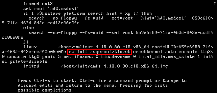 2. e를 눌러 커널 편집 인터페이스로 들어간 뒤, ↑↓ 버튼으로 linux의 첫번째 항으로 이동해 ro를 rw init=/sysroot/bin/bash로 바꿉니다. 다음 이미지를 참고하십시오.