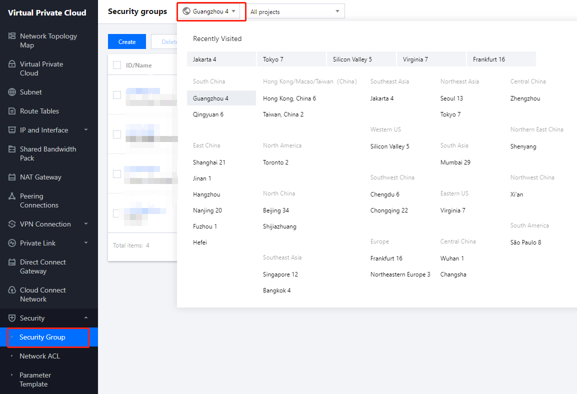 3. 보안 그룹 관리 페이지에서 리전을 선택하고 규칙을 내보낼 보안 그룹을 찾습니다.
