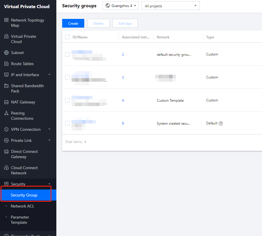 2. 왼쪽 사이드바에서 보안 그룹을 클릭하여 보안 그룹 관리 페이지로 이동합니다.