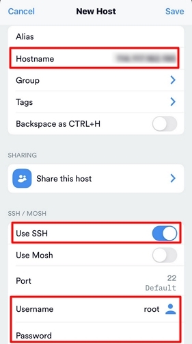 3. 'New Host' 페이지에서 다음 이미지와 같이 로그인 정보를 설정합니다.