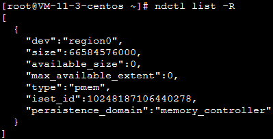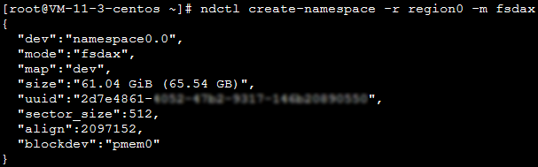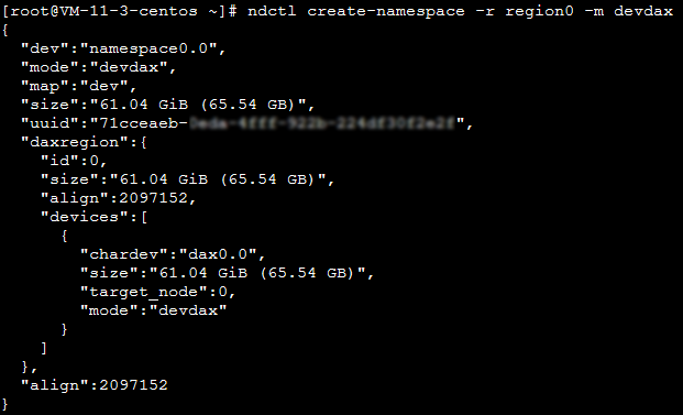가장 큰 인스턴스에는 두 개의 region이 있으므로 가장 큰 인스턴스를 사용하는 경우 다음 명령어를 동시에 실행하십시오. ndctl create-namespace -r region1 -m devdax -f