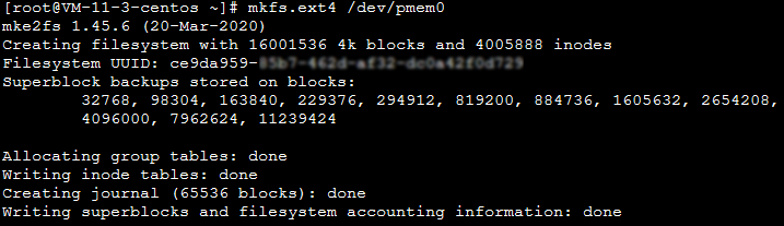 AD 모드의 PMEM을 고속 블록 장치로 설정할 수도 있으며, 일반 블록 장치로 파일 시스템 생성, 베어 디스크 읽기/쓰기 등 작업을 할 수 있습니다. 설정 방법은 다음과 같습니다.