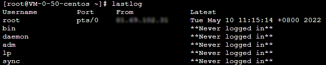 /var/log/lastlog 파일에서 마지막 사용자 로그인 정보를 보려면 lastlog 명령을 실행합니다. 반환된 결과는 다음과 같습니다.