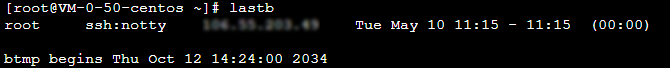 /var/log/btmp 파일에서 시스템 로그인에 실패한 모든 사용자의 정보를 보려면 lastb 명령을 실행합니다. 반환된 결과는 다음과 같습니다.