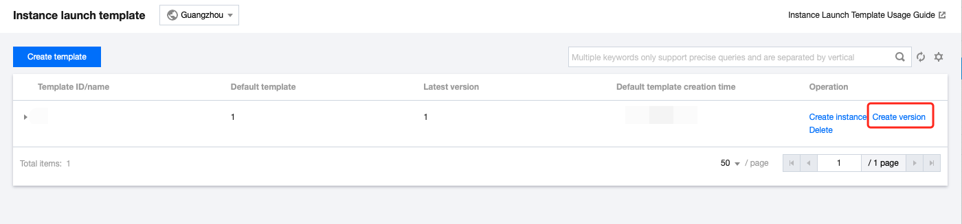 성공적으로 생성된 후 인스턴스 실행 템플릿 페이지에서 템플릿이 있는 행 앞에 있는 를 클릭하고, 전개된 리스트에서 버전을 조회할 수 있습니다. 인스턴스 템플릿 기본 버전 지정