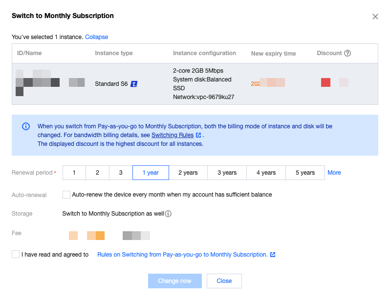 연장 기간: 정액 과금제로 변경된 후의 구매 기간을 선택합니다. 여러 개 인스턴스 일괄 변경인 경우 동일한 구매 기간 설정만 가능합니다.