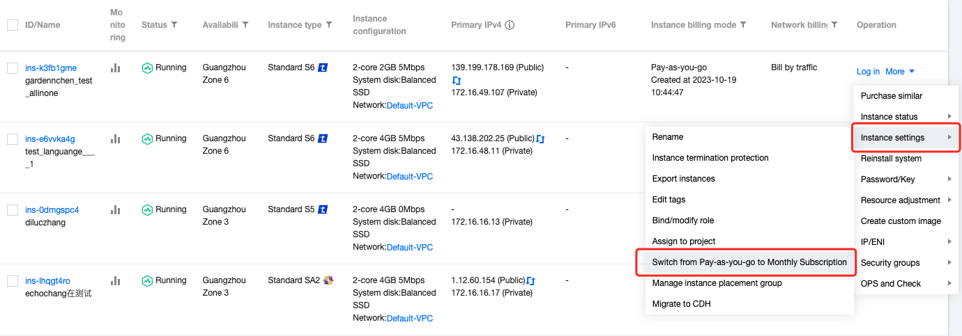 변경할 모든 인스턴스를 체크하고, 상단부에 있는 더보기 > 인스턴스 설정 > 종량제에서 정액 과금제로 변경을 클릭합니다. 이러한 방식으로 인스턴스 과금 방식을 일괄로 변경할 수 있습니다. 아래 그림과 같이: