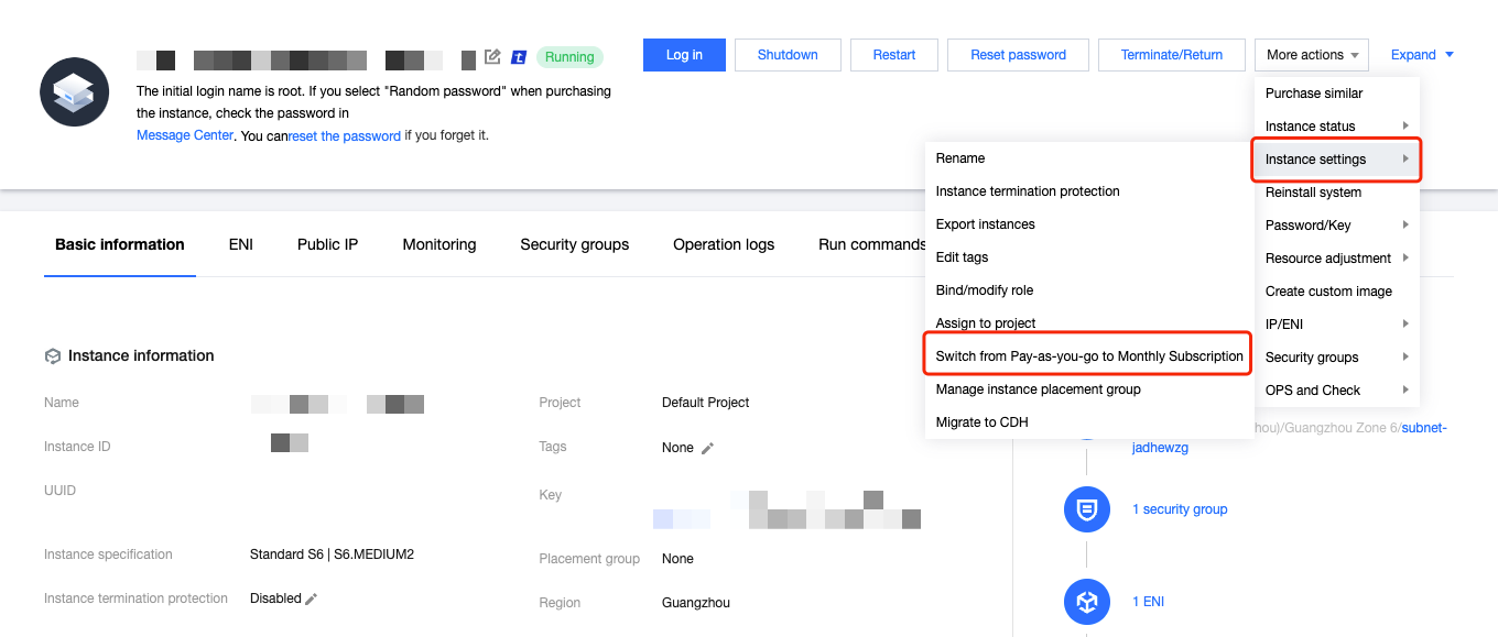 목록 뷰: 오른쪽에 있는 조작바에서 더보기 > 인스턴스 설정 > 종량제에서 정액 과금제로 변경을 선택합니다. 아래 그림과 같이: