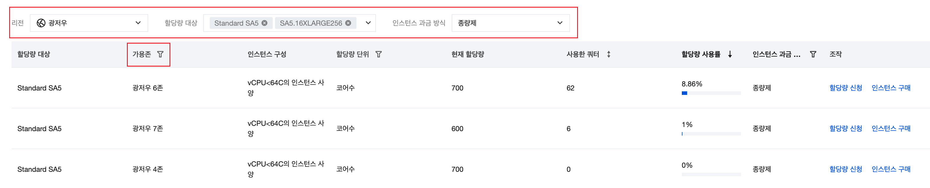 페이지에서 리전, 가용존, 과금 방식을 선택하여 인스턴스를 검색함으로써, 각 리전, 각 가용존 및 특정 과금 방식 하에 구체적인 모델의 현재 할당량과 사용된 할당량을 확인할 수 있습니다.
