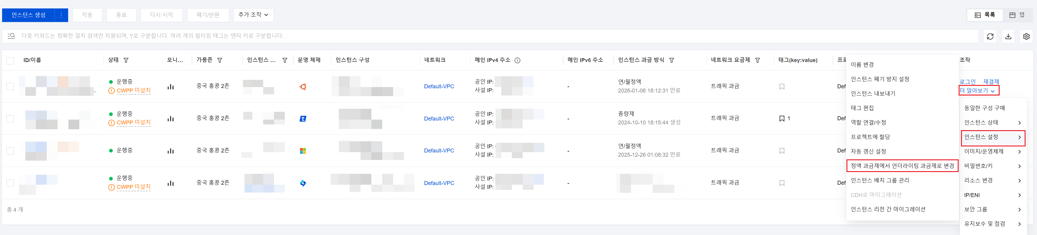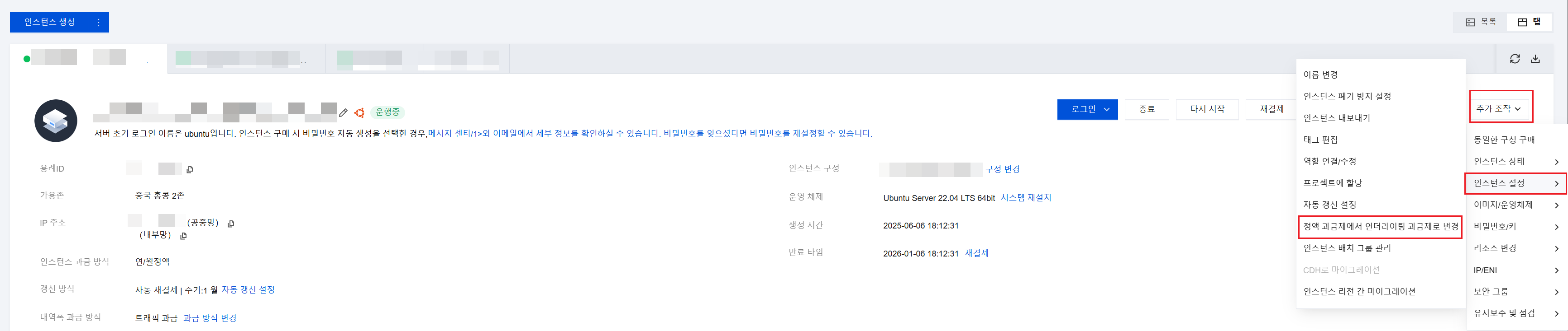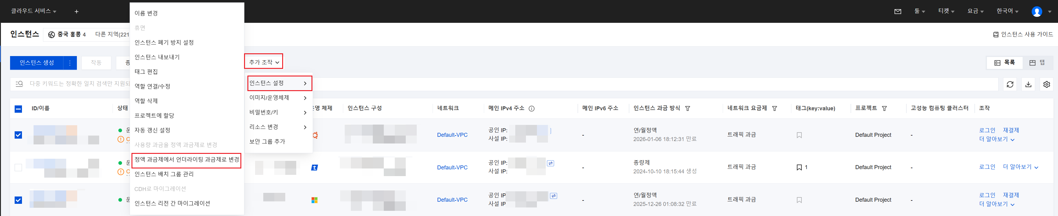 또한 변경할 인스턴스를 선택하고, 상단의 추가 조작 > 인스턴스 설정 > 정액 과금제에서 언더라이팅 과금제로 변경을 클릭할 수 있습니다.