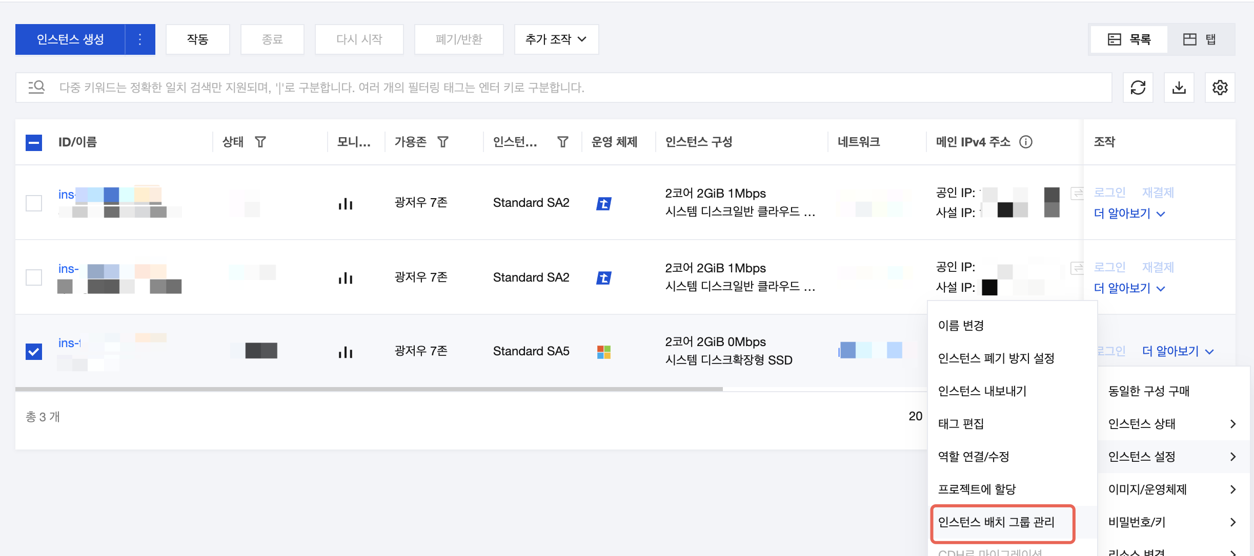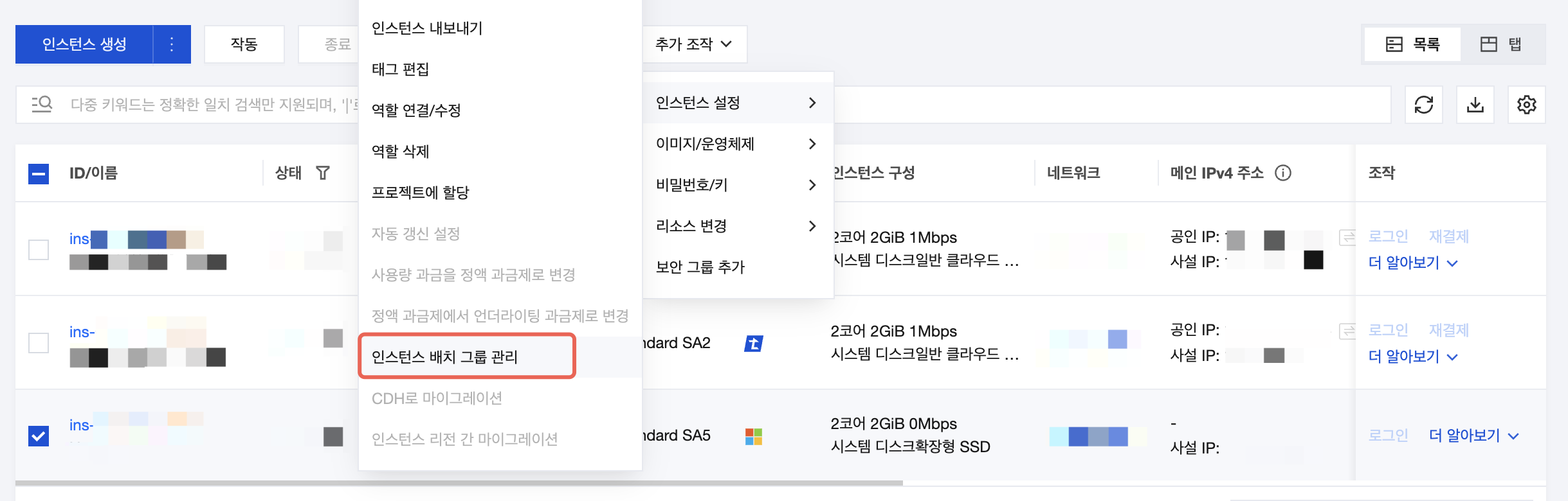 일괄 작업: 하나 이상의 대상 인스턴스를 선택하고 인스턴스 목록 상단에서 추가 조작 > 인스턴스 설정 > 인스턴스 배치 그룹 관리을 클릭합니다.