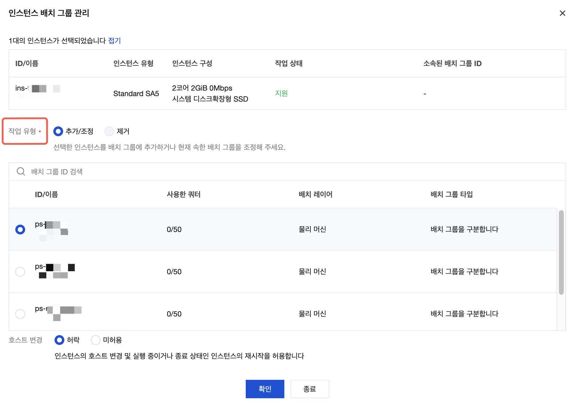 추가/조정: 배치 그룹에 속하지 않은 인스턴스를 배치 그룹에 추가하거나, 기존 배치 그룹에 속한 인스턴스를 다른 배치 그룹으로 변경합니다.
