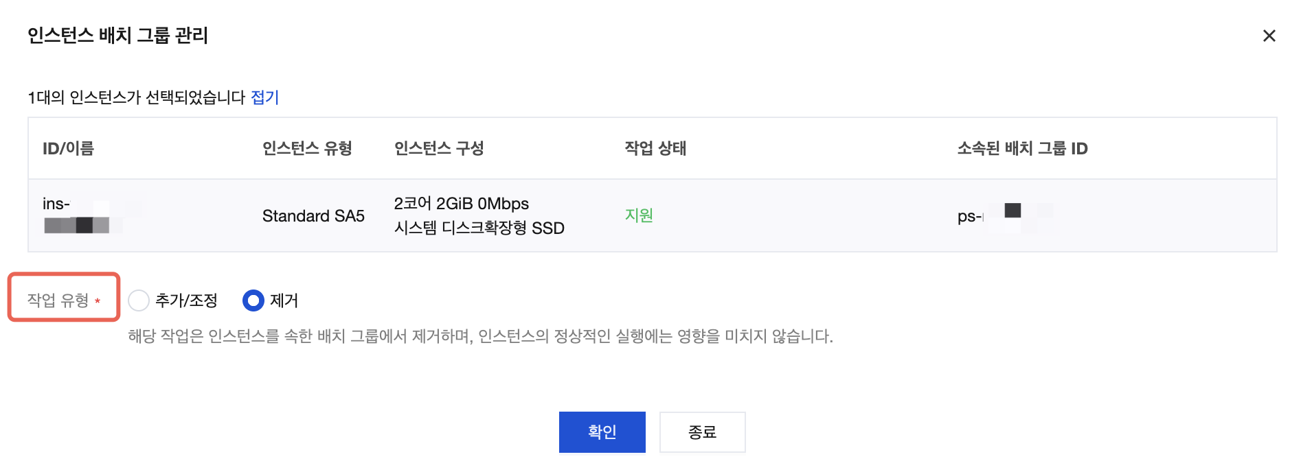 안내 메시지 보기: 해당 작업은 인스턴스를 속한 배치 그룹에서 제거하며, 인스턴스의 정상적인 실행에는 영향을 미치지 않습니다.