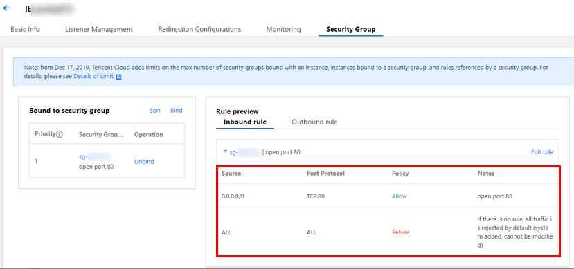 CLB 인스턴스에 보안 그룹이 구성되지 않은 경우 모든 트래픽이 허용되며 CLB 인스턴스의 VIP에 리스너로 구성된 포트에만 액세스할 수 있습니다. 따라서 수신 포트는 모든 IP의 트래픽을 허용합니다.