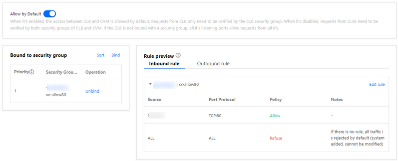 CLB 보안 그룹 구성이 완료되면 포트 80에서만 CLB에 액세스할 수 있습니다. 3단계: 기본 허용 구성