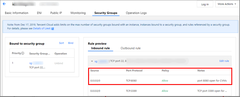 보안 그룹 콘솔로 이동하여 보안 그룹 정책을 구성합니다. 인바운드 규칙에서 모든 IP의 모든 포트는 8080입니다. 원활한 원격 CVM 로그인 및 Ping 서비스를 보장하려면 보안 그룹에서 22, 3389 및 ICMP 서비스를 엽니다. 2. 보안 그룹을 CVM 인스턴스에 바인딩
