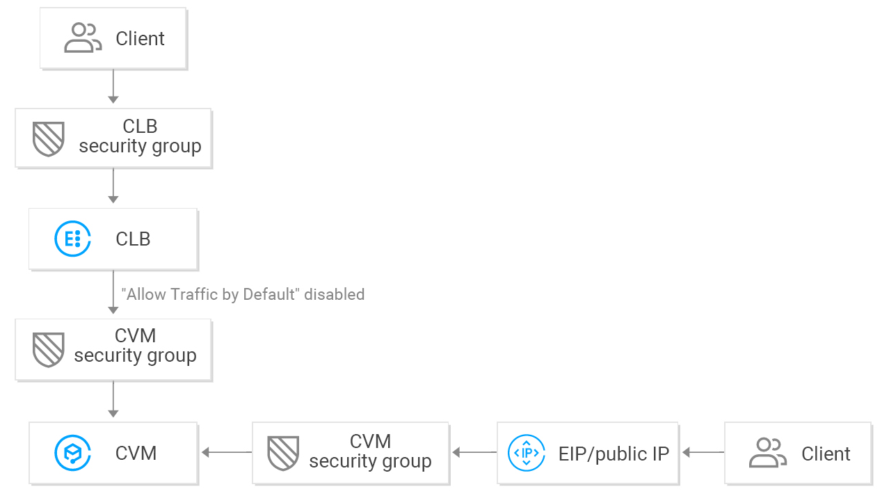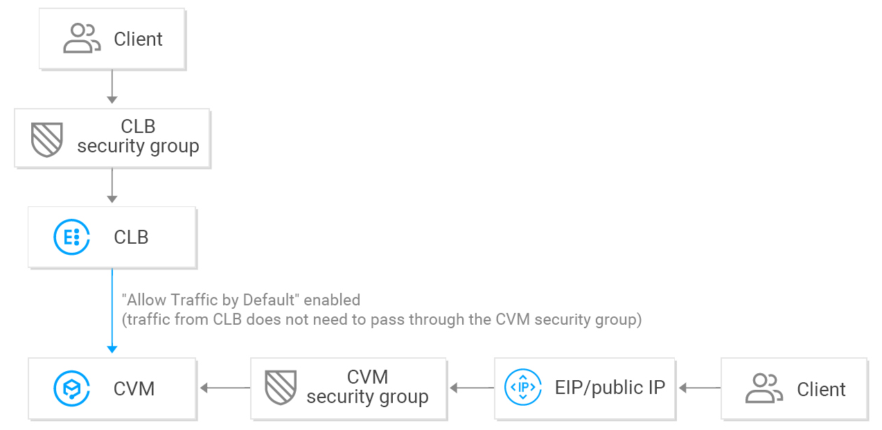 지정된 Client IP의 트래픽을 허용하려면 CLB 보안 그룹과 CVM 보안 그룹 모두에서 해당 IP를 허용해야 합니다. CLB에 보안 그룹이 없는 경우 CVM 보안 그룹에서 IP를 허용하십시오.