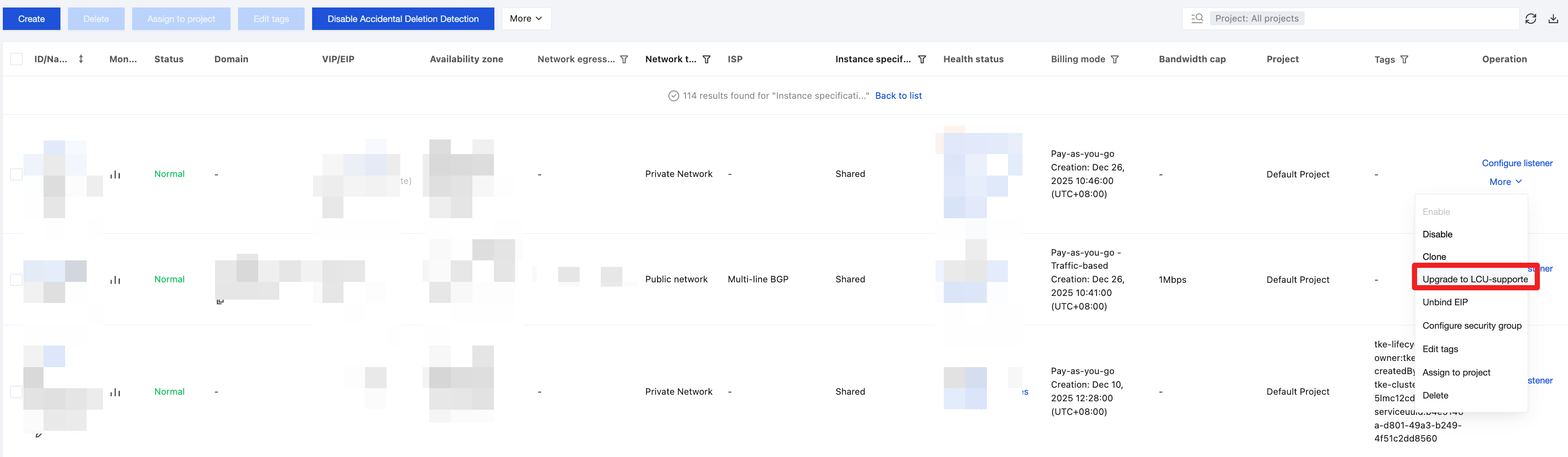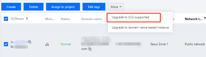 1. 로드 밸런싱 콘솔에 로그인한 후 왼쪽 내비게이션 바에서 인스턴스 관리를 클릭합니다. 2. 로드 밸런싱 인스턴스 목록에서 업그레이드할 대상 공유형 인스턴스를 선택하고 인스턴스 목록 상단의 추가 작업 > 성능 용량형으로 업그레이드를 클릭합니다.