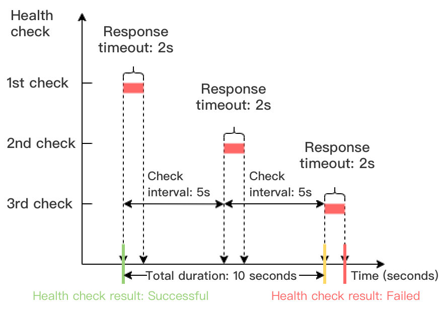 아래 예시에서 상태 확인 응답 시간 초과는 2s, 확인 간격은 5s, 비정상 임계값은 3회이므로, 결과가 실패한 상태 확인의 시간 창 = 5 x (3-1) = 10s.