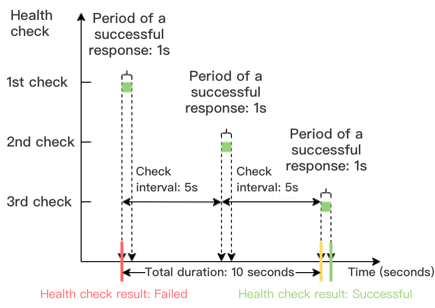 아래 예시에서 성공적인 상태 확인 응답의 기간은 1s, 확인 간격은 5s, 정상 임계값은 3회이므로 성공적인 결과가 있는 상태 확인의 시간 창 = 5 x (3-1) = 10s.