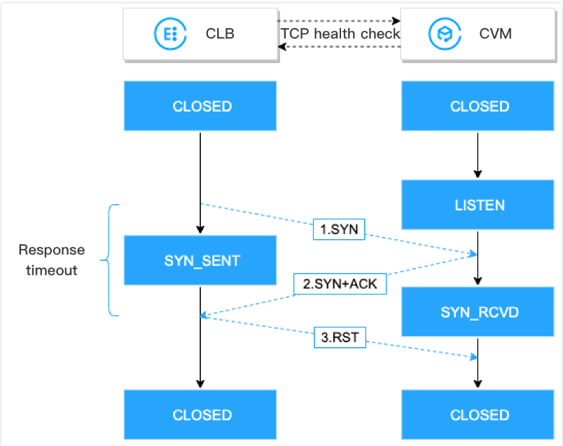 1. CLB 인스턴스는 백엔드 CVM 인스턴스(사설망 IP+상태 확인 포트)에 SYN 연결 요청 패킷을 보냅니다.