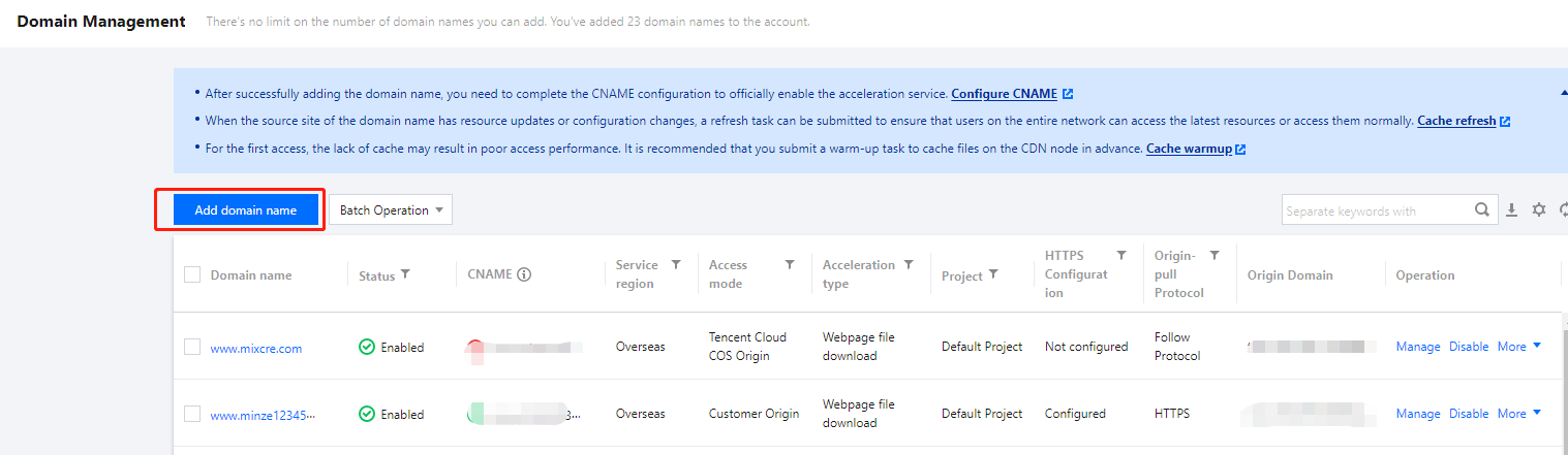 가속 도메인 이름 | 1. 도메인 이름은 최대 81자까지 가능합니다. 2. ICP 비안은 중국 본토에서 실행되는 도메인 이름에 필요합니다. 3. 서브 도메인( a.test.com 또는 a.b.test.com)과 와일드카드 도메인 이름(*.test.com 또는 *.a.test.com)이 지원됩니다. 4. 와일드카드 도메인 이름 또는 연결된 도메인 이름을 연결할 때 도메인 이름 소유권 인증이 필요합니다. 참고: 1. 여기에 와일드카드 도메인 이름을 연결하면 서브 도메인과 두 번째 레벨 와일드카드 도메인 이름을 다른 계정으로 연결할 수 없습니다. 2. *.test.com 및 *.a.test.com 형식의 도메인 이름은 동시에 구성할 수 없습니다. 3. 이제 언더바와 punycode로 변환된 중국어를 포함하는 도메인 이름을 사용할 수 있습니다. • 중국 내 중국어 도메인 이름은 중국어 형식으로 관련 ICP 비안이 완료되어야 합니다. • 중국어 도메인 이름, 예: ‘중국어.도메인 이름’은 타사 툴을 통해 ‘xn--fiq228c.xn--eqrt2g’로 변환한 후 연결할 수 있습니다. • 언더바가 포함된 도메인 이름, 예: ‘test_qq.tencent.cloud’는 직접 추가할 수 있습니다. 4. 악성 또는 고위험 도메인 이름은 연결할 수 없습니다. 자세한 내용은 사용 제한을 참고하십시오. |