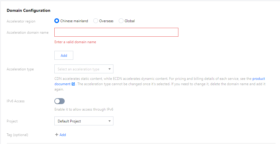 IPv6 액세스 | (선택 사항)CDN 노드는 기본적으로 IPv4 액세스를 지원합니다. IPv6 액세스는 활성화된 후에 지원됩니다. 참고: IPv6 액세스는 중국 내에서만 사용할 수 있습니다. |