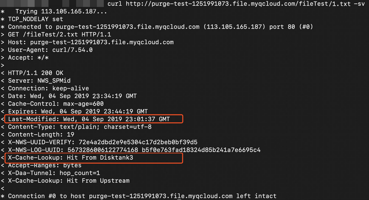 5. 퍼지가 완료되면 1.txt Last-Modified 파일이 변경되므로 직접 원본 가져오기 요청이 진행되며, 2.txt 파일은 변경사항이 없어 디렉터리 퍼지가 제출되어도 노드 히트에 의해 반환됩니다.