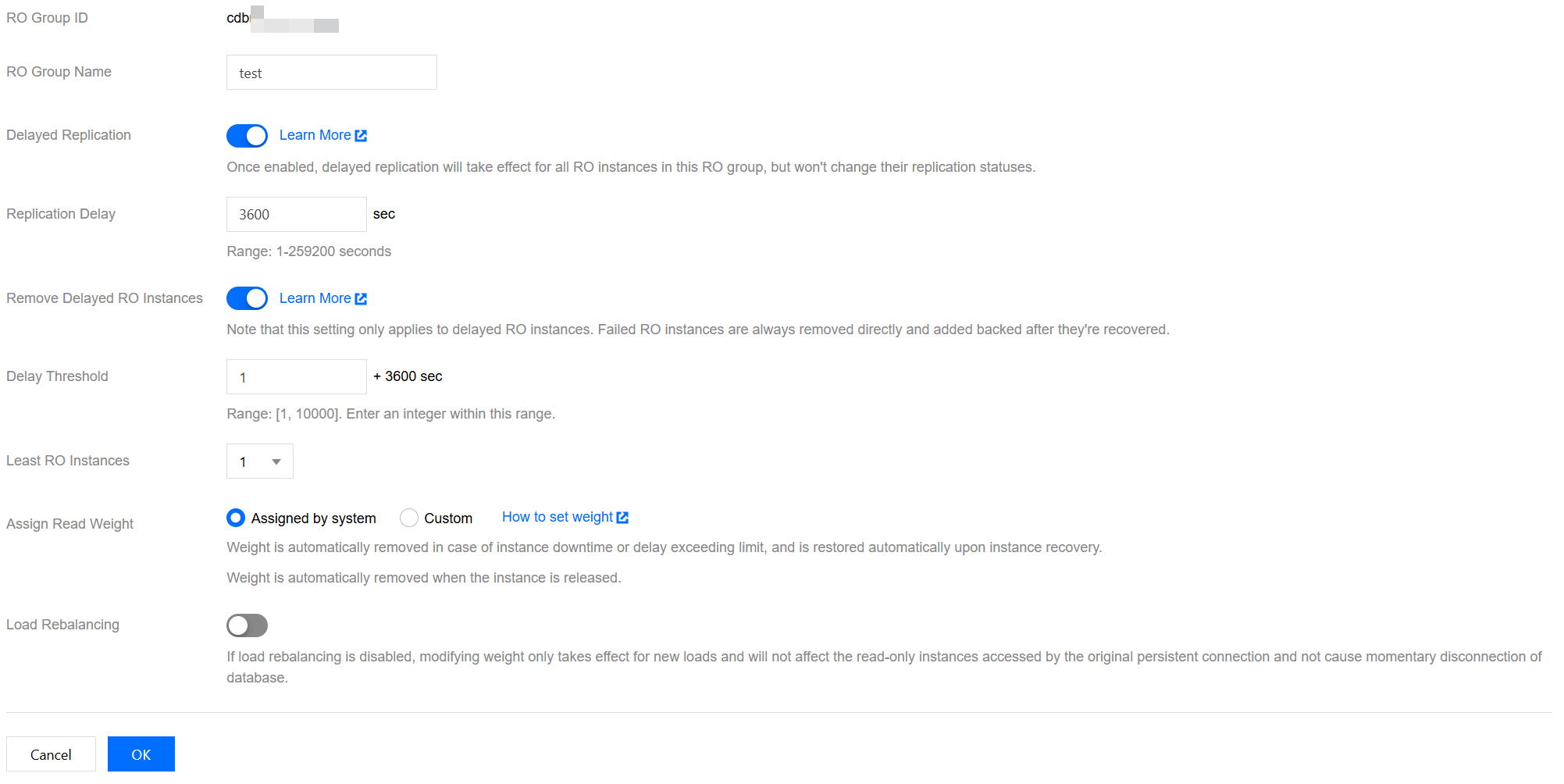 읽기 전용 RO 그룹의 설정 인터페이스에서 읽기 전용 RO 그룹 ID, 이름, 인스턴스 딜레이 복사, 딜레이 시간, 인스턴스 딜레이 시간 초과 제거, 딜레이 임계값, 최소 보관 인스턴스, 읽기 가중치 등 기본 정보를 설정할 수 있습니다.