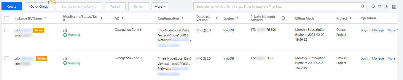 재시작 | 하나 이상의 대상 인스턴스를 선택하고 인스턴스 리스트 상단의 재시작을 클릭하여 다시 시작합니다. 재시작하는 동안 인스턴스에 액세스할 수 없으며 인스턴스에 대한 기존 연결이 닫힙니다. 재시작하는 동안 비즈니스 쓰기 수와 더티 페이지 수가 많으면 다시 시작하지 못합니다. 이 경우 인스턴스는 재시작 전의 상태로 돌아가 액세스할 수 있게 됩니다. 재시작 성공을 보장하고 비즈니스에 미치는 영향을 최소화하려면 사용량이 적은 시간에 인스턴스를 다시 시작하십시오. |