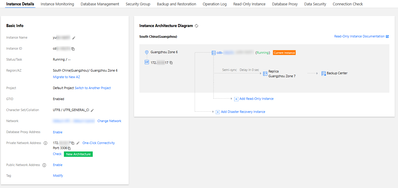 읽기 전용 인스턴스 | 읽기 전용 인스턴스 탭에서 읽기/쓰기 분리 및 단일 소스 다중 복제 애플리케이션 시나리오에 적용하여 데이터베이스의 읽기 로드 용량을 높일 수 있는 하나 이상의 읽기 전용(RO) 인스턴스를 생성할 수 있습니다. 자세한 내용은 읽기 전용 인스턴스 생성을 참고하십시오. |