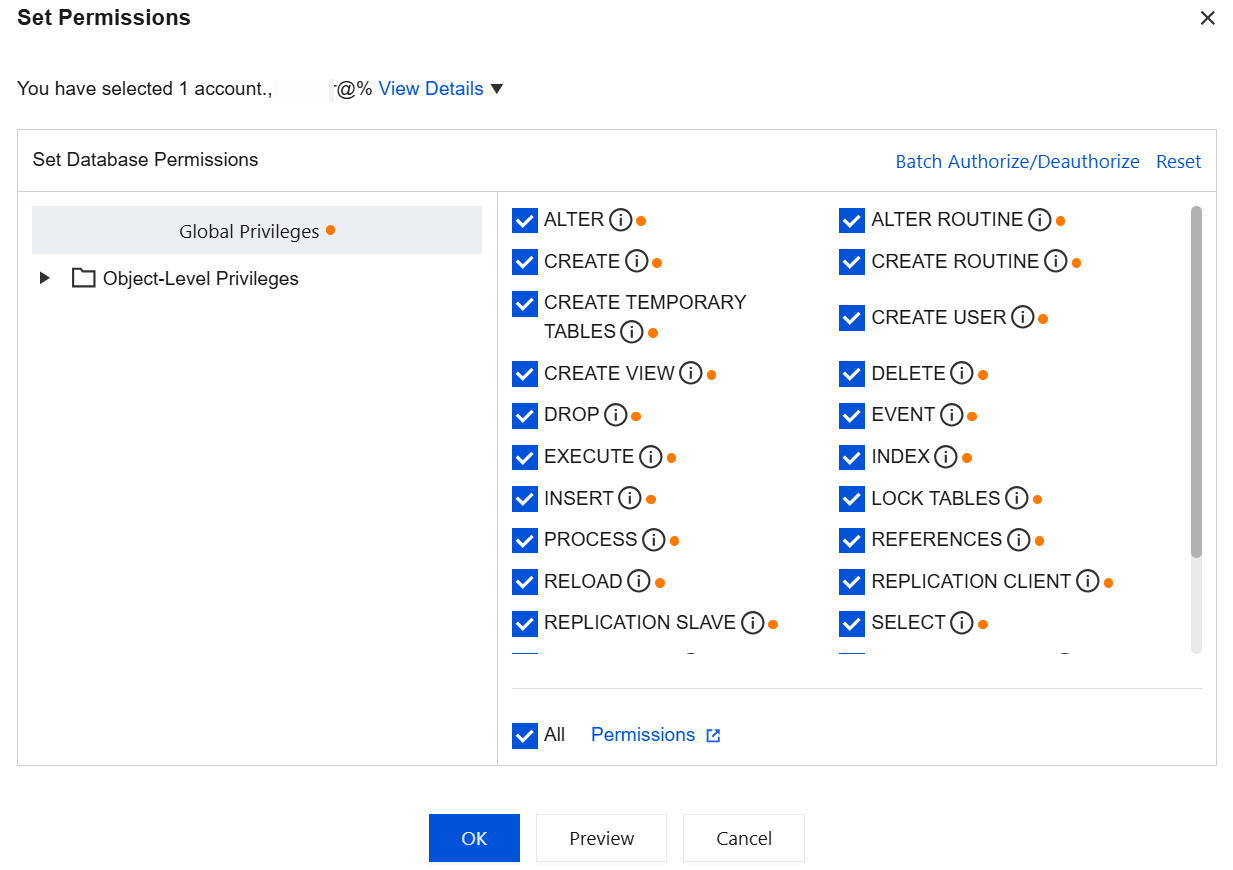 ALTER | 데이터베이스 내 테이블 구조 수정 권한으로, 테이블 필드 수정, 테이블 필드 추가, 테이블 필드 삭제, 테이블 인덱스 추가 및 삭제 등 작업에 대한 권한을 포함합니다. |