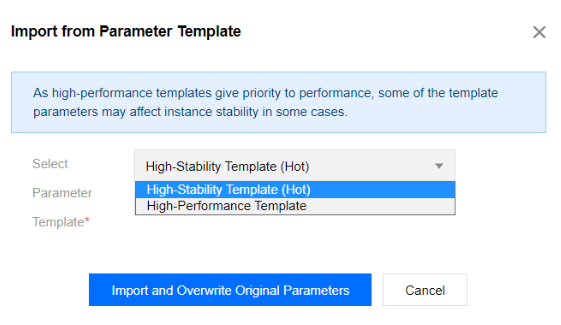 1. MySQL 콘솔에 로그인한 후, 인스턴스 리스트에서 인스턴스 ID를 클릭하여 인스턴스 관리 페이지로 이동합니다. 2. 데이터베이스 관리 > 매개변수 설정을 선택하고 기본 템플릿을 클릭한 후, 고안정성 템플릿 또는 고성능 템플릿을 선택한 다음 가져오기 및 기존의 매개변수 덮어쓰기를 클릭합니다.