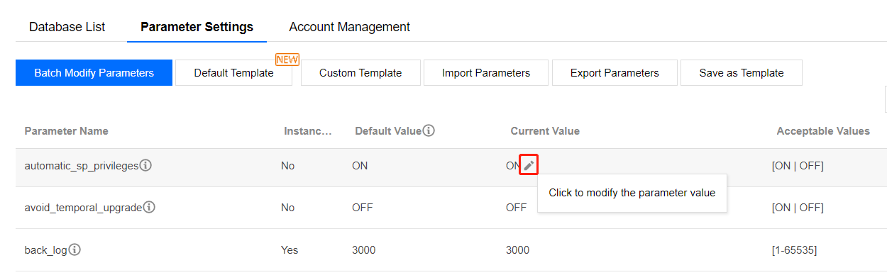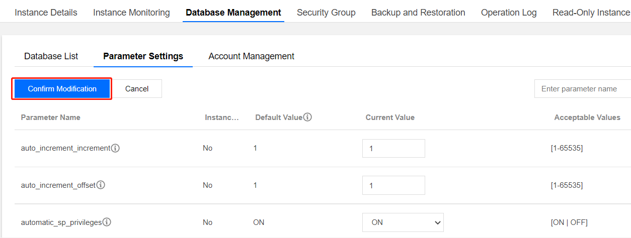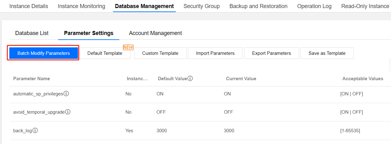 1. MySQL 콘솔에 로그인한 후, 인스턴스 리스트에서 인스턴스 ID를 클릭하여 인스턴스 관리 페이지로 이동합니다. 2. 데이터베이스 관리 > 매개변수 설정 탭을 선택하고 매개변수 가져오기를 클릭합니다.