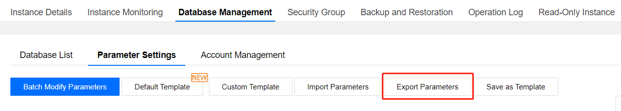 1. MySQL 콘솔에 로그인한 후, 인스턴스 리스트에서 인스턴스 ID를 클릭하여 인스턴스 관리 페이지로 이동합니다. 2. 데이터베이스 관리 > 매개변수 설정 탭을 선택하고 매개변수 내보내기를 클릭하여 매개변수 구성 파일을 내보냅니다.