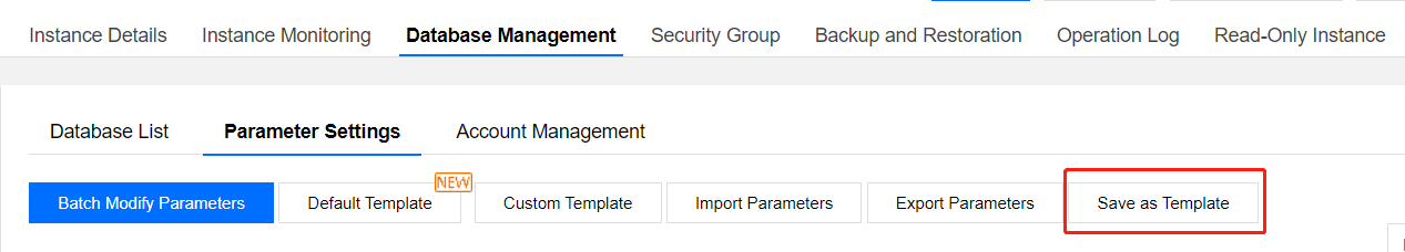 1. MySQL 콘솔에 로그인한 후, 인스턴스 리스트에서 인스턴스 ID를 클릭하여 인스턴스 관리 페이지로 이동합니다. 2. 데이터베이스 관리 > 매개변수 설정 탭을 선택하고 템플릿으로 저장을 클릭하여 기존 매개변수 구성을 매개변수 템플릿으로 저장합니다.