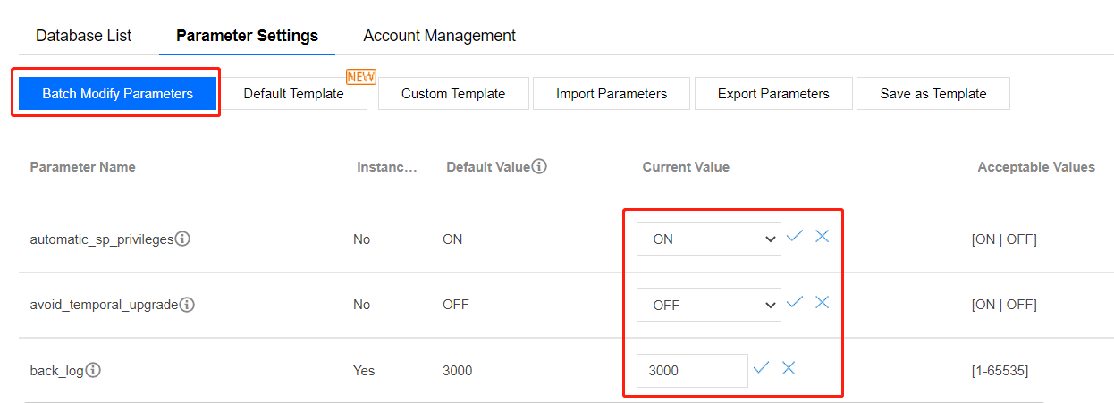 2. 데이터베이스 관리 > 매개변수 설정페이지를 선택하고 매개변수 일괄 수정을 클릭합니다.