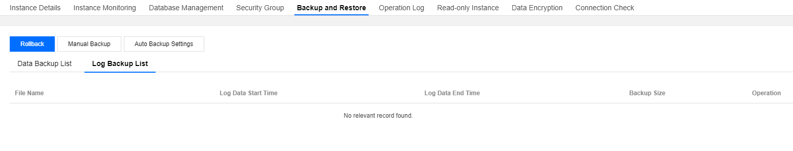 MySQL 콘솔에 로그인한 후, [Backup and Restore] > [Log Backup List] 페이지에서 로그를 조회하고 다운로드할 수 있습니다. 데이터베이스 인스턴스에 왜 binlog 로그가 없나요?
