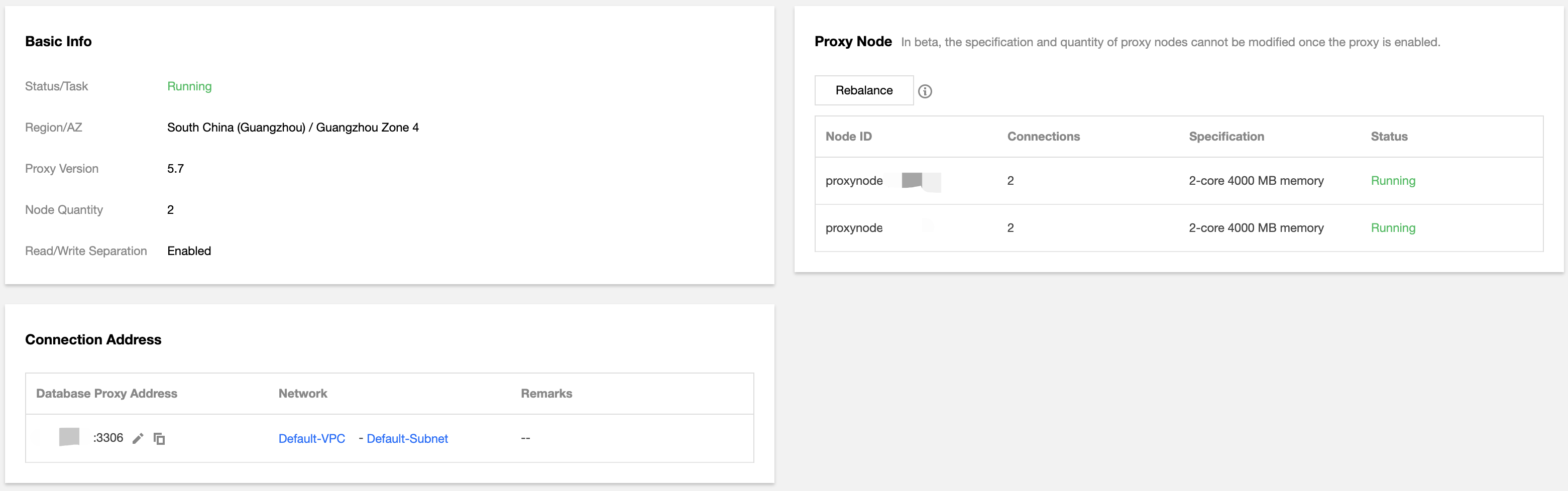 읽기 가중치 할당 | 시스템에서 할당 또는 사용자 지정을 선택할 수 있습니다. 데이터베이스 프록시가 활성화되었을 때 여러 AZ가 구성된 경우 서로 다른 AZ에서 프록시 노드의 가중치를 별도로 할당할 수 있습니다. |