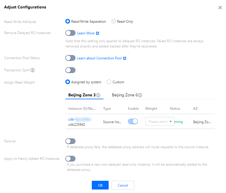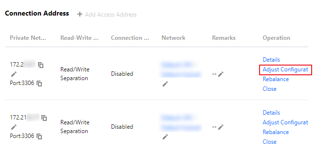 1. MySQL 콘솔에 로그인한 후, 페이지 상단의 리전을 선택하고 대상 인스턴스 ID를 클릭하여 인스턴스 관리 페이지로 이동합니다. 2. 인스턴스 관리 페이지에서 데이터베이스 프록시 > 개요를 선택하고 연결 주소에서 대상 액세스 주소를 찾은 다음 작업 열에서 구성 조정을 클릭합니다.