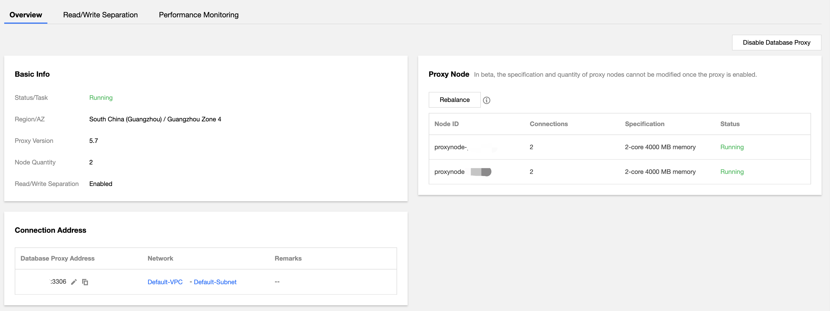 데이터베이스 프록시를 비활성화하기 전에 생성된 데이터가 삭제되고 데이터베이스 프록시가 비활성화된 후에는 복구할 수 없으므로 클라이언트가 프록시 주소를 통해 데이터베이스에 액세스하지 않는지 확인하십시오.