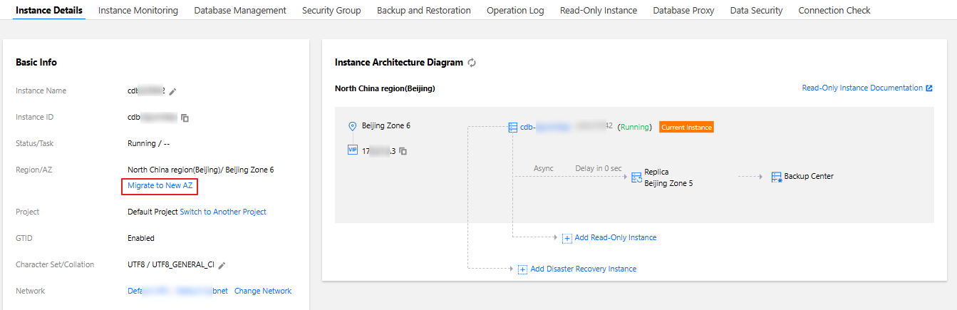 2. 인스턴스 세부 정보 페이지에서 기본 정보 > 리전/AZ를 선택하고 새 AZ로 마이그레이션을 클릭하거나 가용성 정보 > 배포 모드를 선택하고 복제본 AZ 수정을 클릭합니다.