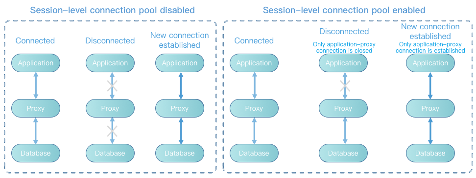 세션 수준 연결 풀은 비지속 연결 시나리오에 적합합니다. 세션 수준 연결 풀은 주로 짧은 연결 서비스에 대한 새 연결의 빈번한 설정으로 인해 발생하는 인스턴스 부하를 줄이는 데 사용됩니다. 클라이언트 연결이 끊어지면 시스템은 현재 연결이 유휴 연결인지 확인하고, 유휴 연결이면 시스템은 해당 연결을 프록시의 연결 풀에 넣고 잠시 동안 보관합니다.