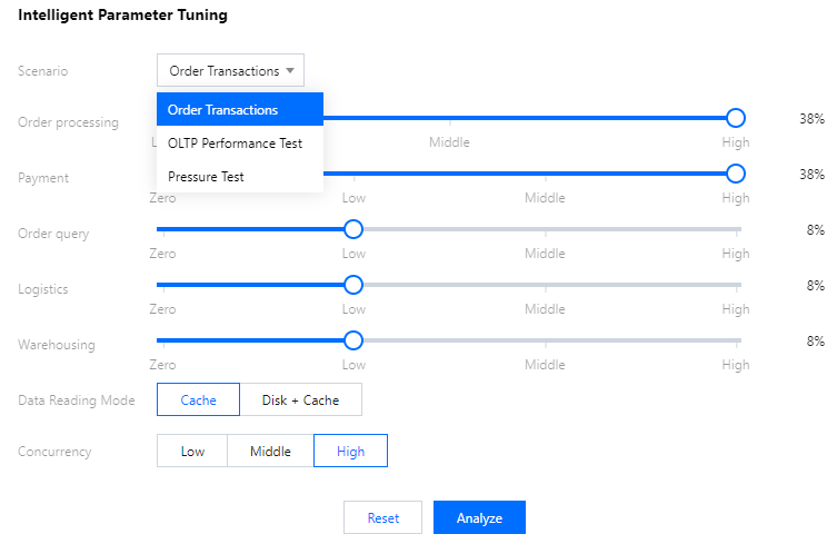 시나리오 드롭다운 목록에서 비즈니스 시나리오(주문 트랜잭션, OLTP 성능 테스트 또는 압력 테스트)를 선택합니다.