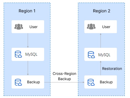 리전 간 백업은 인스턴스가 위치한 리전 또는 백업이 위치한 리전으로 데이터를 복구할 수 있습니다.