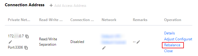 1. MySQL 콘솔에 로그인한 후, 상단의 리전을 선택하고 대상 인스턴스 ID를 클릭하여 인스턴스 관리 페이지로 이동합니다. 2. 인스턴스 관리 페이지에서 데이터베이스 프록시 > 개요를 선택하고 연결 주소에서 대상 액세스 주소를 찾은 다음 작업 열에서 리밸런싱을 클릭합니다.
