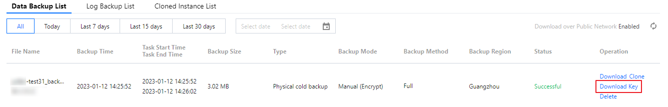 2. 인스턴스 관리 페이지에서 백업 및 복구 > 데이터 백업 리스트 탭을 선택하고 대상 백업을 찾은 후 작업 열에서 다운로드 키를 클릭합니다.